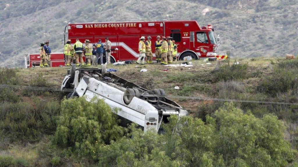 Varios pasajeros fueron arrojados del autobús, y uno de los muertos quedó atrapado debajo del vehículo después de que aterrizó en su techo poco después de las 10 a.m., junto a la Interestatal 15 en Pala Mesa, una comunidad no incorporada a unas 45 millas (72 kilómetros) al norte de San Diego, El portavoz del Distrito de Protección contra Incendios del Condado Norte, John Choi, dijo.