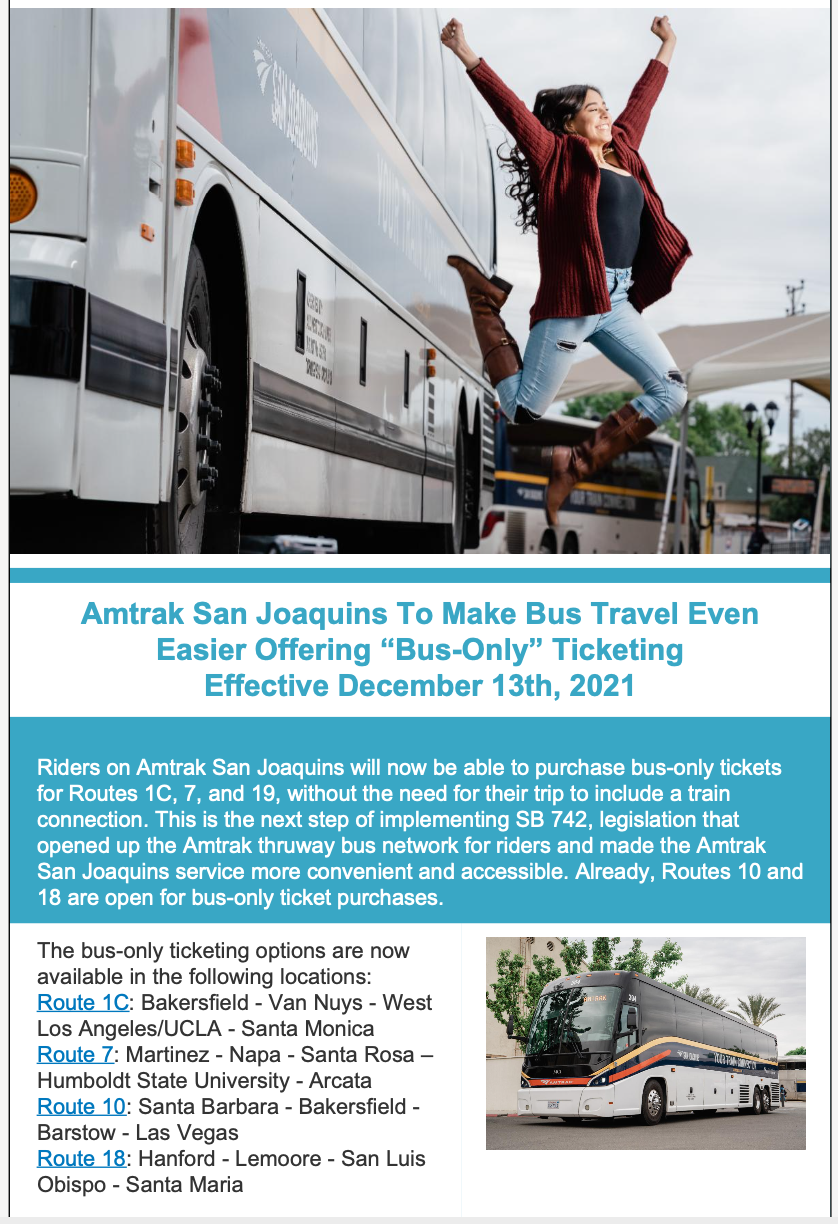 (13 de diciembre de 2021, Stockton, CA) Los pasajeros de Amtrak San Joaquins ahora podrán comprar boletos de autobús solo para las Rutas 1c, 7 y 19, a partir del 13 de diciembre, sin la necesidad de que su viaje incluya una conexión de tren. . Los pasajeros ahora podrán viajar desde destinos como Bakersfield a Santa Mónica en la Ruta 1c o Eureka a Petaluma en la Ruta 7, donde antes un pasajero no podía hacerlo. Este es el siguiente paso en la implementación de la SB 742, legislación que abrió la red de autobuses Amtrak Thruway para los pasajeros e hizo que el servicio de Amtrak San Joaquins fuera más conveniente y accesible. Las rutas 10 y 18 ya están abiertas para la compra de boletos de autobús únicamente.