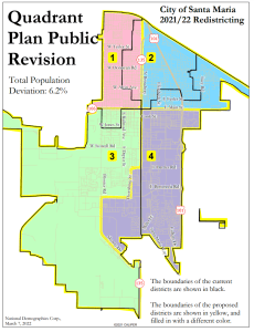 Aqui esta el proceso de redistribución de distritos de la Ciudad de Santa María. La Oficina del Secretario Municipal recibió dos nuevos borradores de mapas de redistribución de distritos para que el Concejo Municipal los considere en su audiencia pública el 15 de marzo a las 6:00 p.m. en el Centro Comunitario Maramonte, 620 East Sunrise Drive, Santa María.