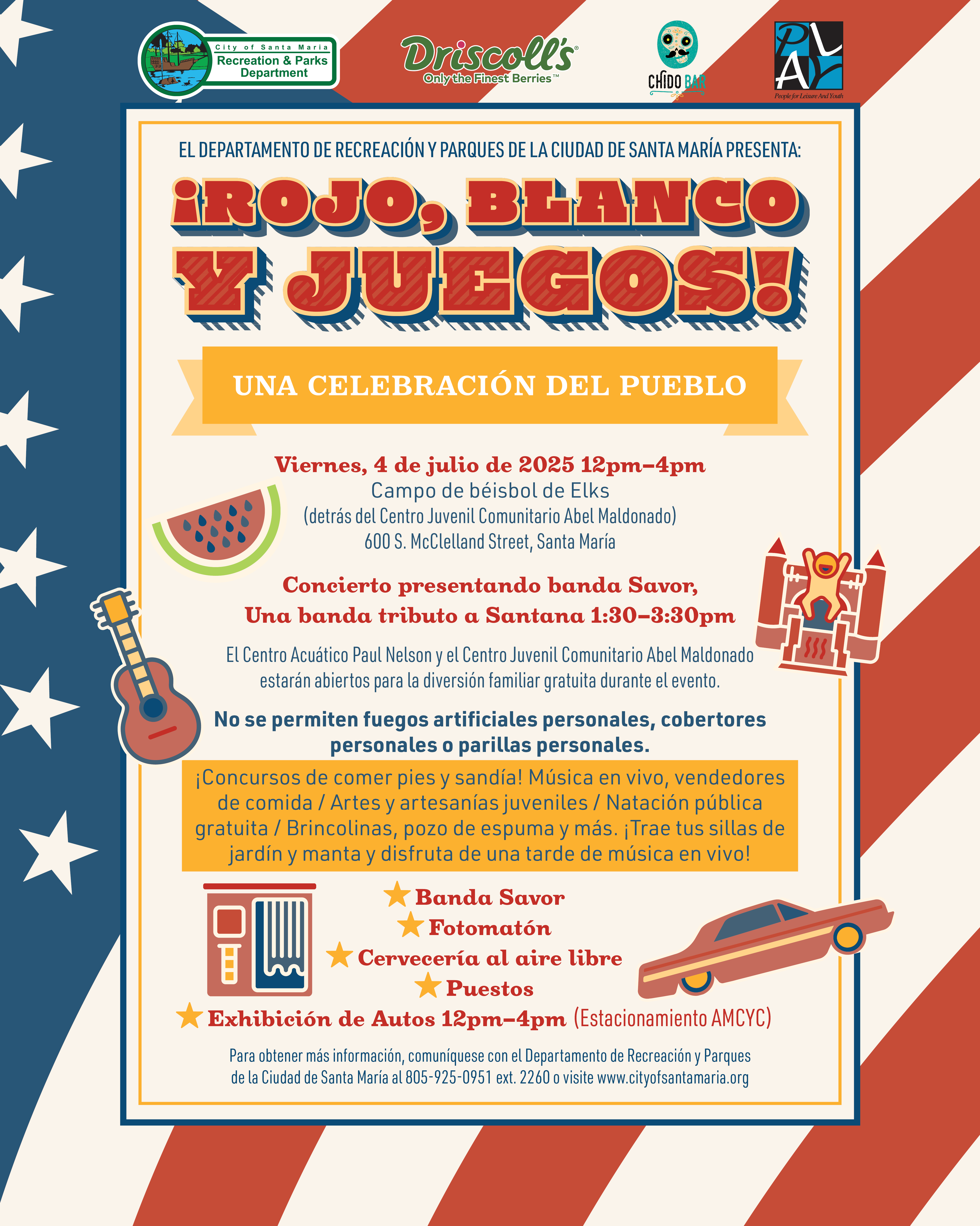 El Departamento de Recreación y Parques de la Ciudad de Santa Maria, en colaboración con PLAY, Inc., y el patrocinador principal Driscoll’s Berries, invitan a la comunidad a celebrar el Día de la Independencia en el evento Rojo, Blanco y A JUGAR: Una Celebración Local el viernes 4 de julio, de 12:00 a 4:00 p.m., en el Campo de Béisbol Elks, ubicado detrás del Centro Comunitario Juvenil Abel Maldonado, en el 600 South McClelland Street.