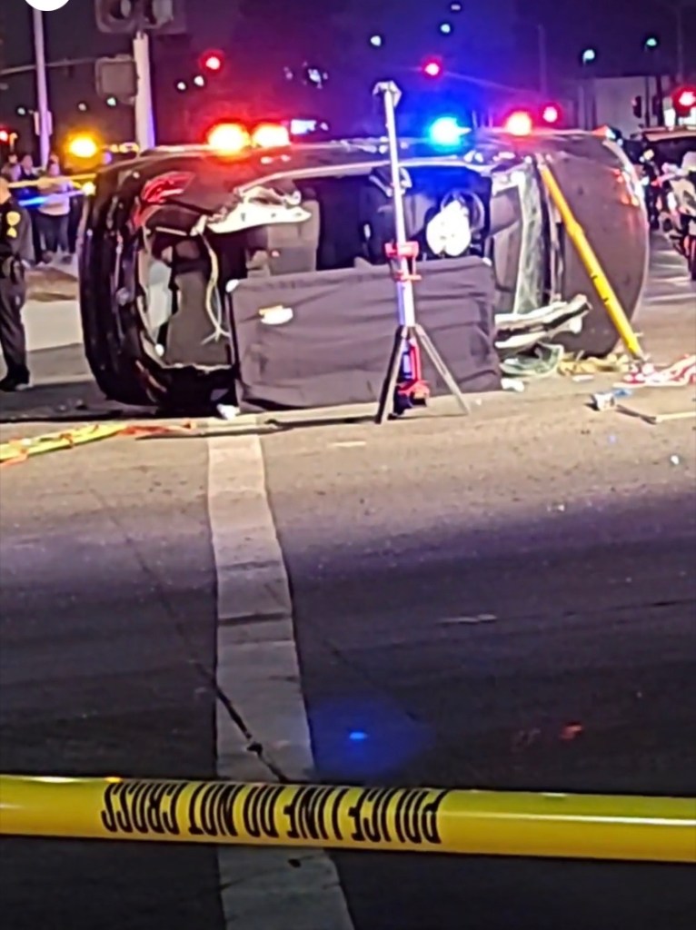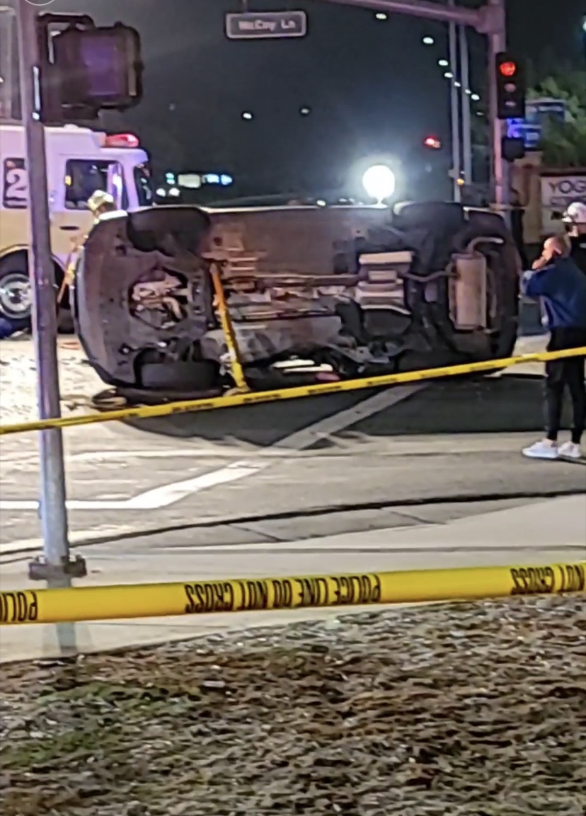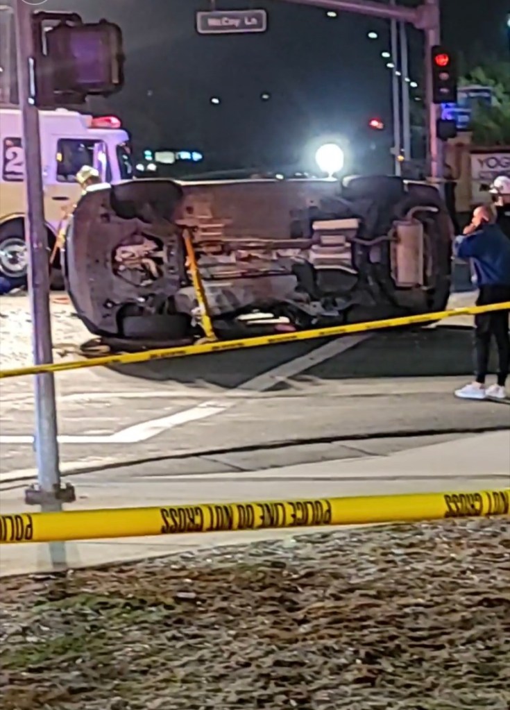 . La colisión hizo que el automóvil se volcara de costado. El motociclista fue declarado muerto en la escena y el conductor del automóvil resultó ileso.