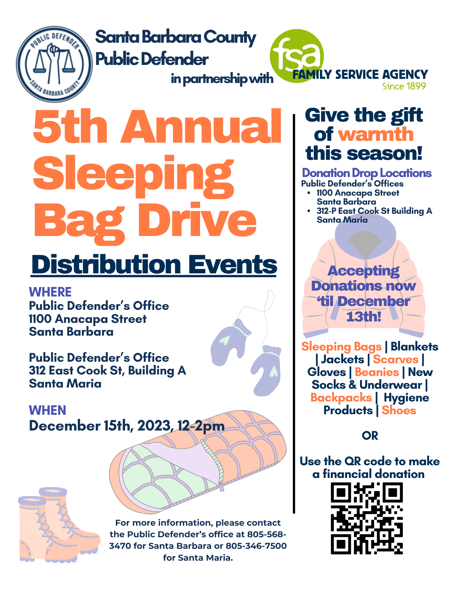 También se aceptan donaciones financieras para la compra de sacos de dormir y ropa interior nuevos, y son deducibles de impuestos a través de la asociación del Defensor Público con la Agencia de Servicios Familiares de Santa Bárbara. Las donaciones financieras pueden hacerse en línea a través del siguiente sitio web: Colecta de sacos de dormir de 2023 | Agencia de Servicios Familiares (givebox.com). La Agencia de Servicios Familiares no aceptará donaciones de otros artículos.