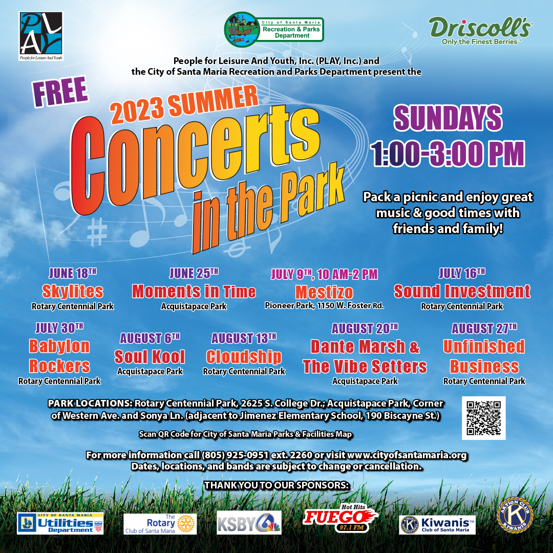Se invita a la comunidad a asistir al próximo Concierto de Verano gratuito en el Parque el domingo 20 de agosto. El Departamento de Parques y Recreación de la Ciudad de Santa María y People for Leisure and Youth, Inc. se complacen en anunciar la actuación de Dante Marsh y The Vibe Setters de 1:00 p. m. a 3:00 p. m. en Acquistapace Park, en la esquina de Western Avenue y Sonya Drive, adyacente a la Escuela Primaria Jimenez.