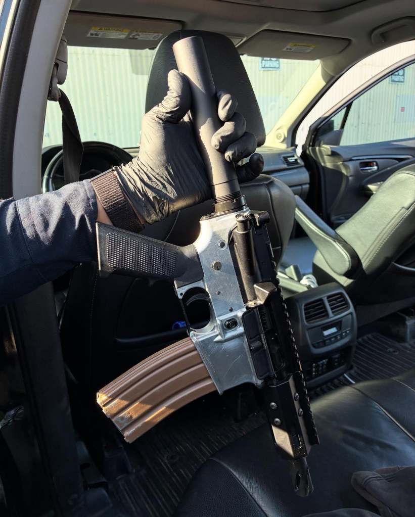 Un registro posterior del vehículo resultó en la recuperación de dos armas de fuego: una pistola AR-15 plateada y negra, cargada y sin número de serie, y una pistola Glock 19 robada.