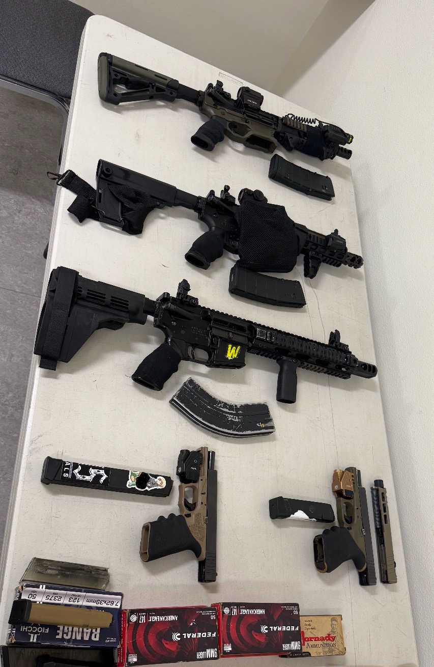 Durante la investigación, los agentes contactaron a un joven de 17 años que se encontraba en libertad condicional por delitos anteriores relacionados con armas. Tras un registro en su domicilio, se encontraron dos pistolas cargadas, tres rifles de asalto tipo AR-15 también cargados, varios cargadores de gran capacidad y munición. Entre las armas había algunas con número de serie, otras sin número de serie y otras con el número de serie alterado.