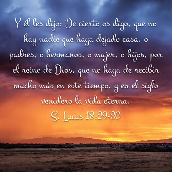Otro versículo importante de este mismo capítulo 18 de Lucas es el siguiente. Lucas 18:29-30 “De cierto os digo, que no hay nadie que no haya dejado casa, o padres, o hermanos, o mujer, o hijos, por el reino de Dios que no haya de recibir mucho más en este tiempo, y en el siglo venidero de la vida eterna”.