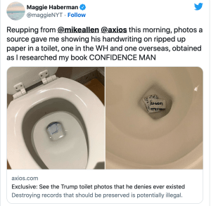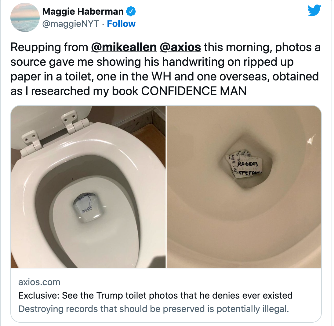 De acuerdo con Axios, Trump periódicamente tiró papeles por el inodoro en la residencia de la Casa Blanca, solo para ser descubierto más tarde cuando se llamó a los reparadores para arreglar los inodoros obstruidos.