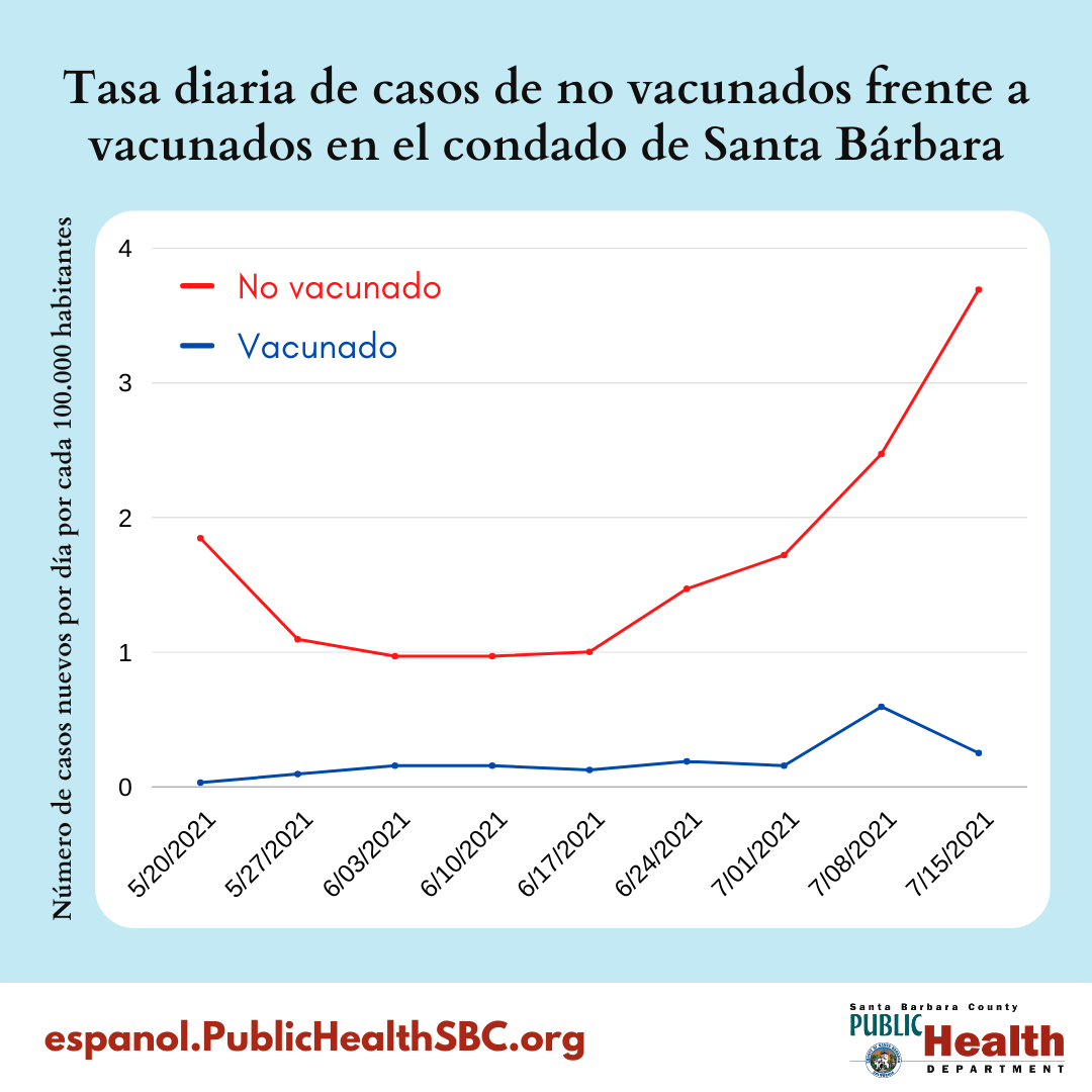 El mayor obstáculo para detener el virus es la proporción de miembros de la comunidad no vacunados. En el Condado de Santa Bárbara, una persona no vacunada tiene 15 veces más probabilidades de infectarse y enfermarse de COVID-19 que si estuviera vacunada. El nuevo aumento es realmente una corriente de personas no vacunadas que enferman y contagian a otras personas.