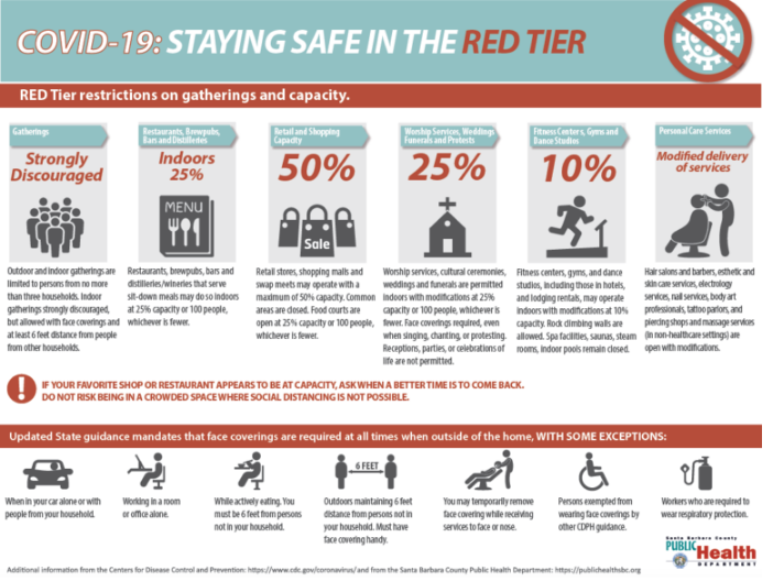 El Plan del Estado permite a los condados en el Nivel Rojo reabrir las operaciones en los interiores de más sectores empresariales y permite que ciertas actividades se reanuden. Todos los negocios en el condado de Santa Bárbara, que están abiertos o serán reabiertos, deben seguir todas las reglas estatales para su industria y certificar que están listos para reabrir por medio de una atestación que necesitan completar en línea. Negocios, que pueden reabrir en los interiores en el nivel rojo con modificaciones incluyen restaurantes, gimnasios, salas de cine, museos, zoológicos y acuarios. Para más información sobre los cambios en el nivel rojo, visite el sitio web de salud pública aquí. www.publichealthsbc.org/red-tier-2021/