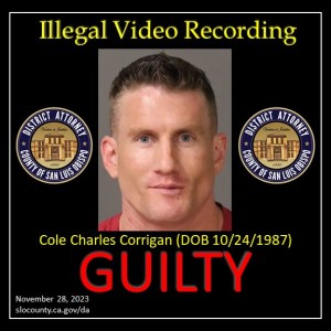 El fiscal de distrito Dan Dow anunció hoy que Cole Charles Corrigan, residente de la ciudad de San Luis Obispo (fecha de nacimiento 24/10/87), se declaró culpable de dos cargos de grabar ilegalmente a los clientes dentro del baño del ahora cerrado CCC Fitness y de ser un delincuente en posesión de un pistola. Los cargos de grabación de vídeo ilegal son delitos menores. El cargo de arma es un delito grave.
