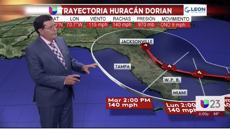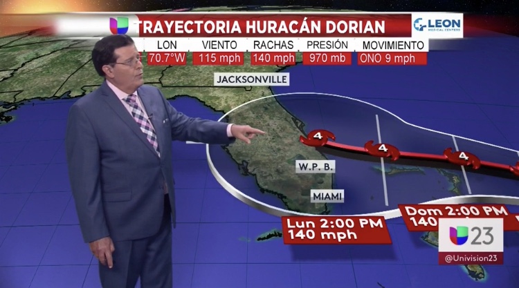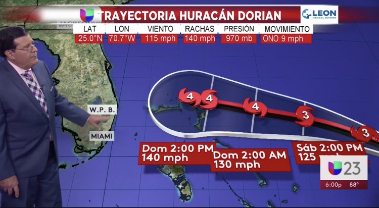 El domingo a las 2:00 p.m. Dorian ya estaría sobre las Bahamas occidentales, y en el sur de Florida ya estaríamos sintiendo vientos con fuerza por lo menos de tormenta tropical.