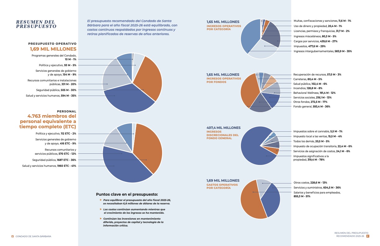 (SANTA BÁRBARA, California) – El Condado de Santa Bárbara ha publicado su Presupuesto Recomendado para el Año Fiscal (AF) 2025-26, con un total de $1.69 mil millones en gastos operativos. Este plan de gastos equilibrado y fiscalmente responsable refleja el compromiso continuo del Condado con la estabilidad del servicio y una planificación financiera prudente en medio de la incertidumbre económica.