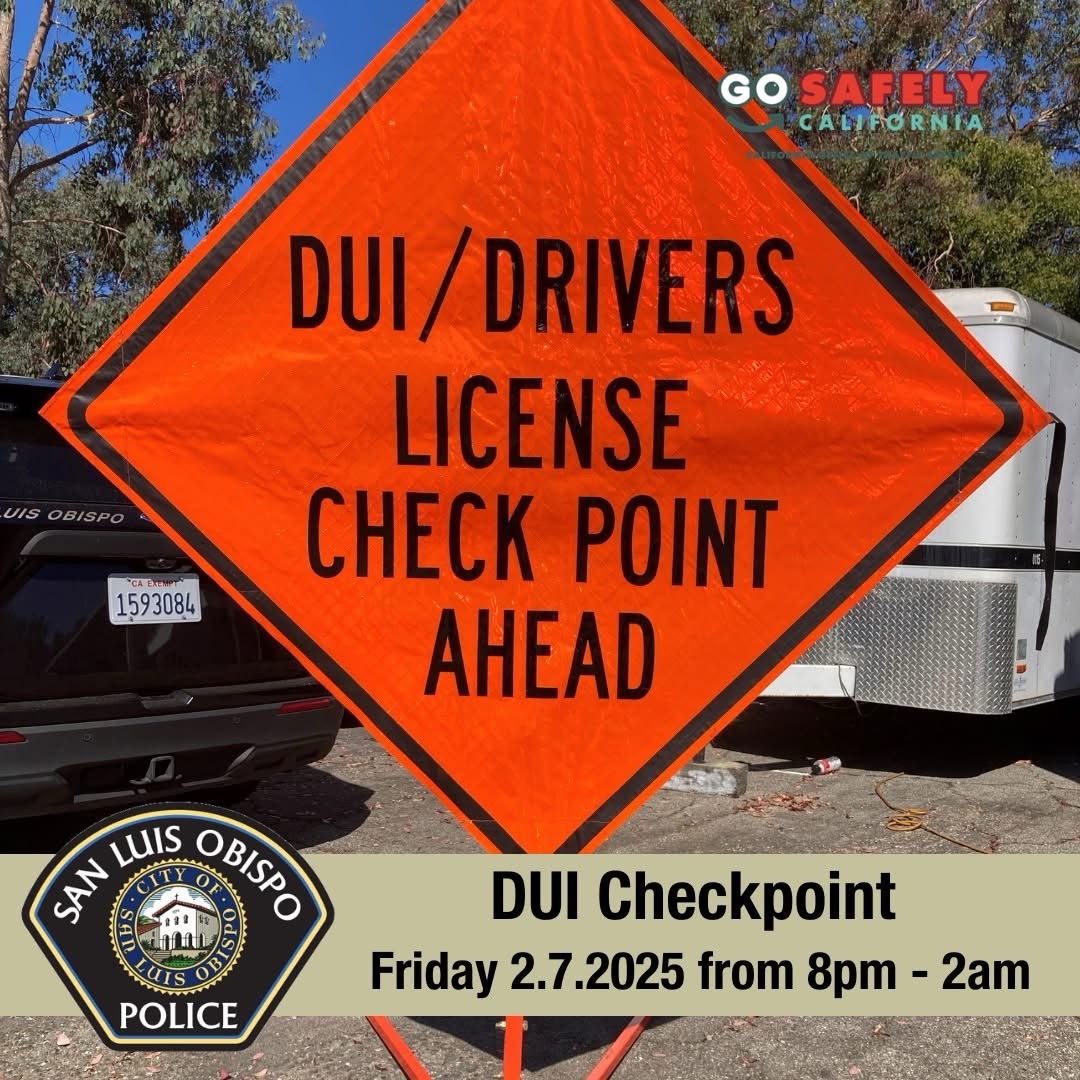 El viernes 7 de febrero de 2025, SLOPD llevará a cabo un punto de control de conducir bajo la influencia (DUI) y de licencia de conducir el 7 de febrero de 8:00 p.m. a 2:00 a.m. en San Luis Obispo.