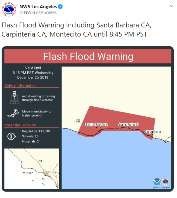 ACTUALIZACIÓN (7:21 p.m.): El Servicio Nacional de Meteorología ha emitido un Aviso de Inundación repentina para la Costa Sur del Condado de Santa Bárbara, incluyendo Santa Bárbara, Carpinteria y Montecito.