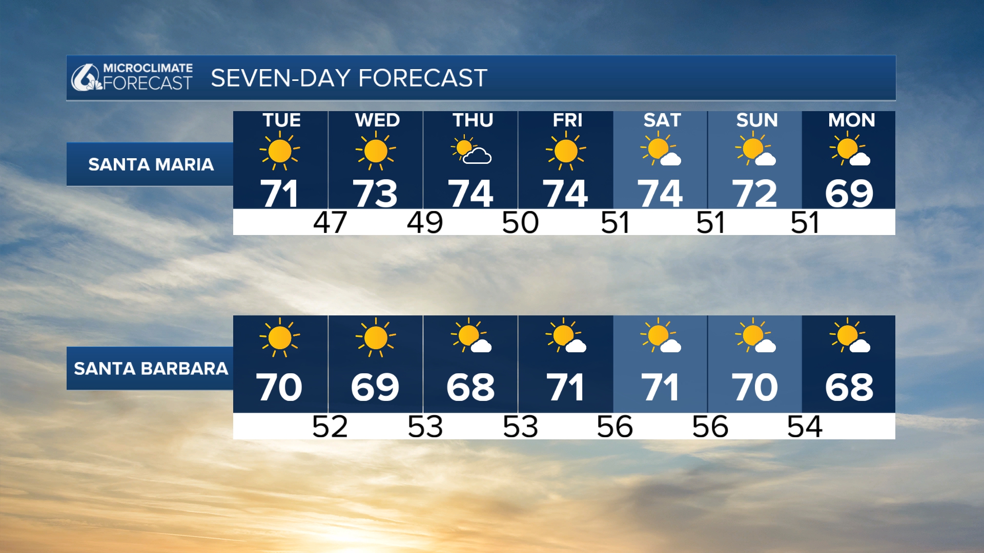 Para el jueves, se pronostica que las temperaturas aumentarán entre 70 y 80 grados en el interior, mientras que las temperaturas de los valles costeros pueden aumentar hasta mediados y superiores de 70, estabilizándose a partir de entonces. Se espera que las zonas costeras experimenten temperaturas entre los 60 grados y los 60 grados superiores, con la posibilidad de que haya algo de nubosidad baja por la noche y por la mañana, que se disipará rápidamente según el patrón en desarrollo.