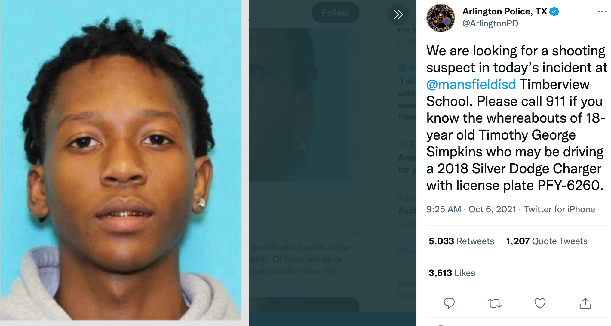 Buscamos a un sospechoso de disparar en el incidente de hoy en @mansfieldisd Timberview School. Llame al 911 si conoce el paradero de Timothy George Simpkins, de 18 años, que puede estar conduciendo un Dodge Charger 2018 Silver con placa PFY-6260.