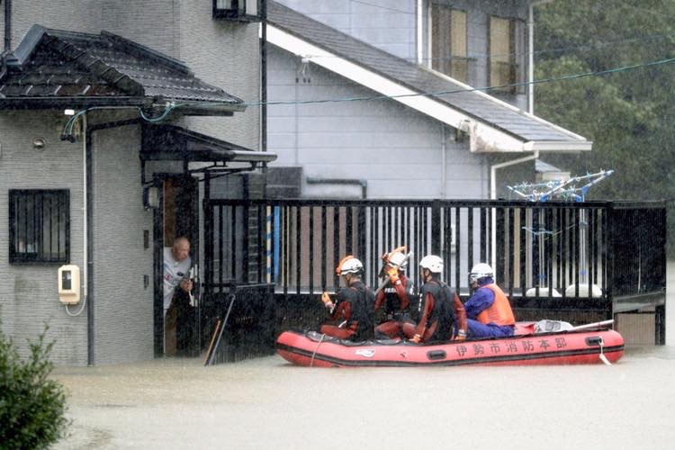 Los rescatistas en un bote patrullan la zona residencial inundada por el tifón Hagibis, en Ise, Japón central, el sábado 12 de octubre de 2019.