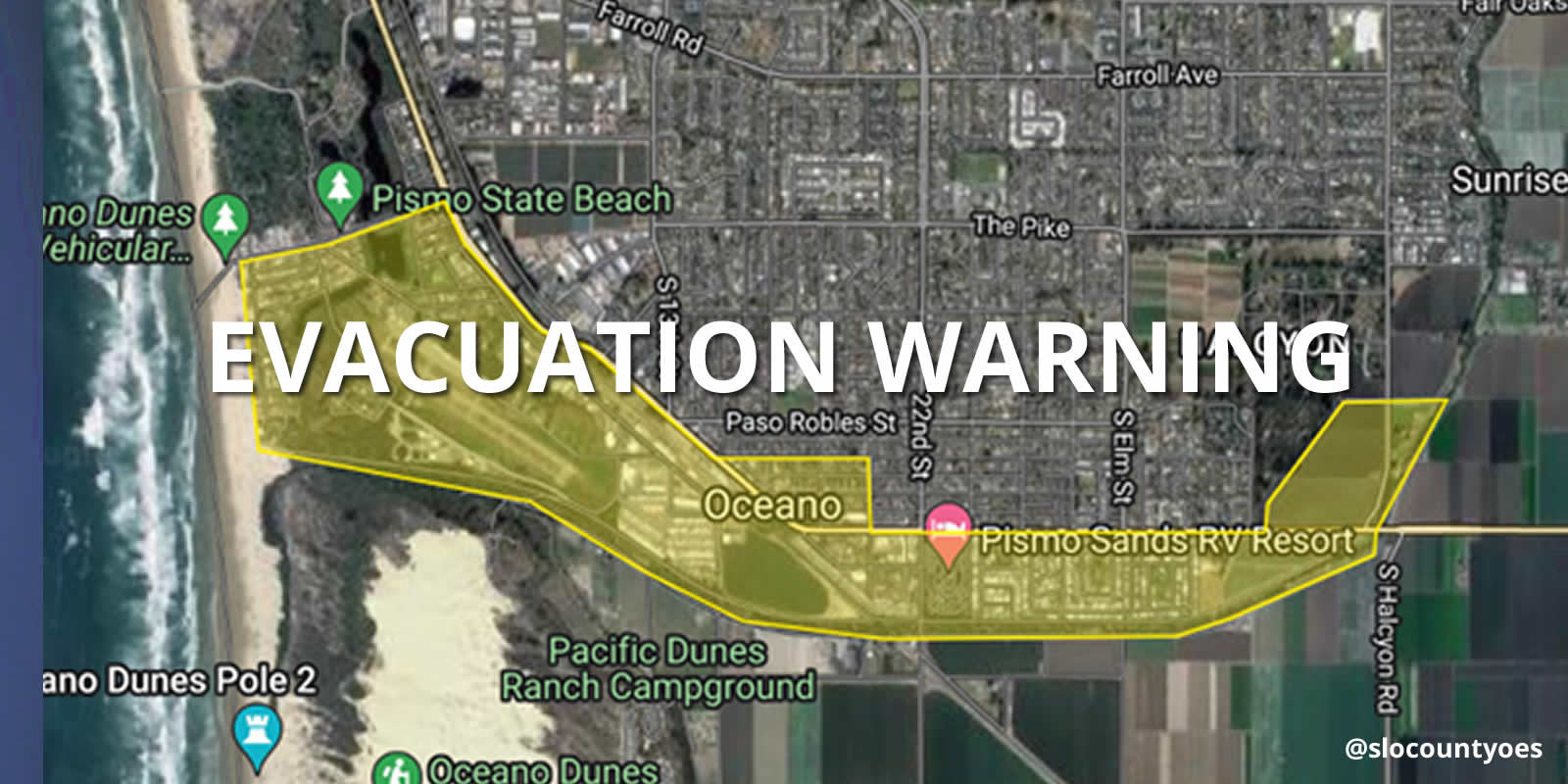 A partir de las 10 a.m. de esta mañana, hay un área bajo una ORDEN de evacuación: eso está en Oceano, al Sur del dique Arroyo Grande Creek. Aquí hay un enlace al mapa de esa área, que está bordeada por la autopista 1, calle 22 y va hacia el parque de RVs/trailas Pacific Dunes Ranch: