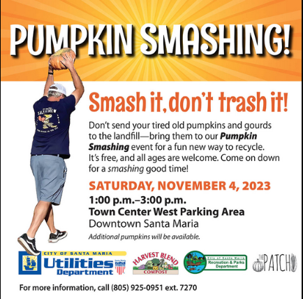 El Departamento de Servicios Públicos de la Ciudad de Santa María organizará su segundo evento anual de aplastamiento de calabazas el sábado 4 de noviembre de 1:00 a 3:00 p.m. Este evento familiar se llevará a cabo en el estacionamiento de Town Center West cerca de Broadway (Carretera 135) y Main Street (Carretera 166). Entrada y el estacionamiento son gratuitos.