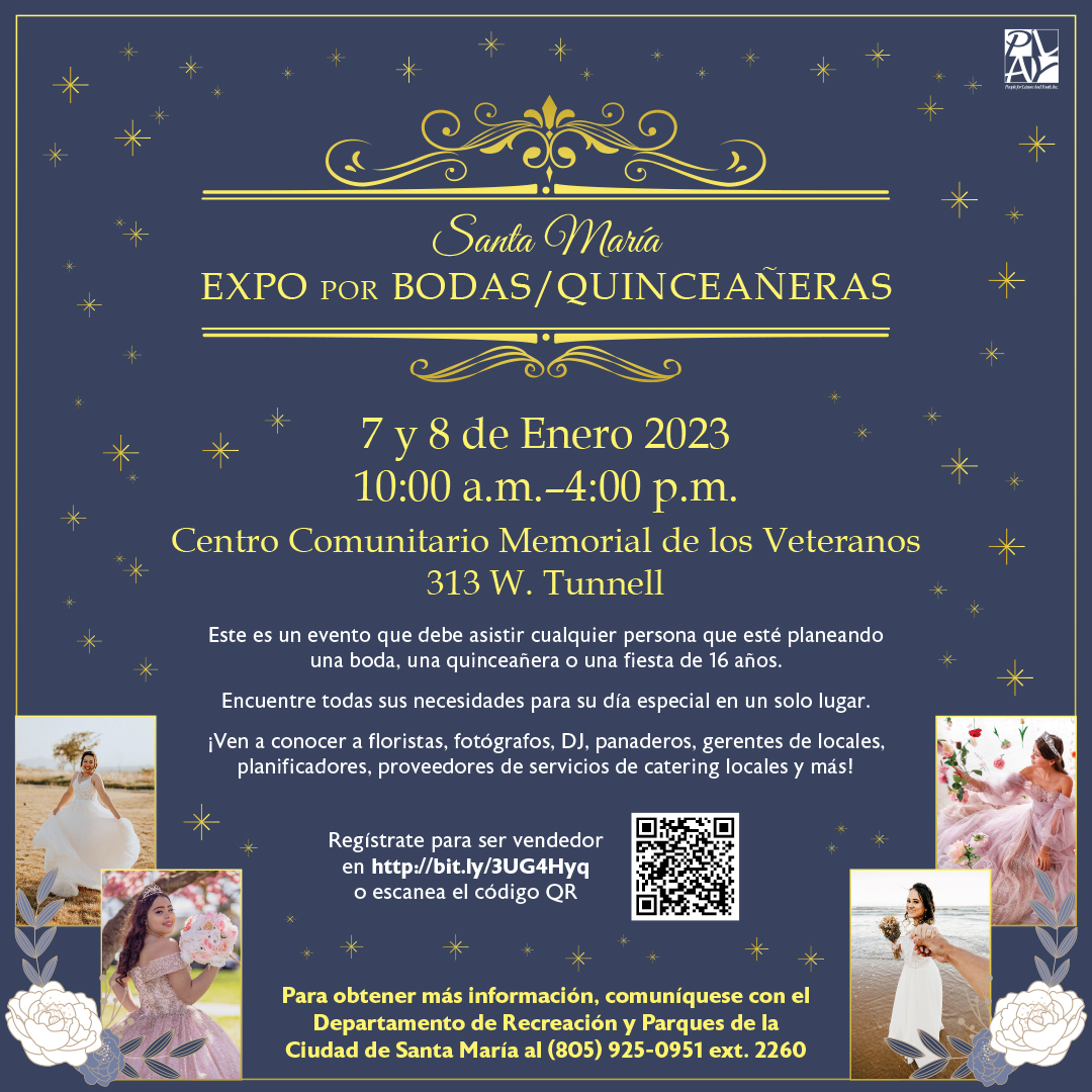 El Departamento de Parques y Recreación de la Ciudad de Santa María invita a los residentes que planean una boda, quinceañera, fiesta de quinceañeros o evento formal a asistir a la Exposición de Bodas/Quince 2023 de Santa María el sábado 7 y el domingo 8 de enero a partir de las 10:00 p.m. am a 4:00 pm en el Veterans’ Memorial Center, 313 East Tunnell Street.