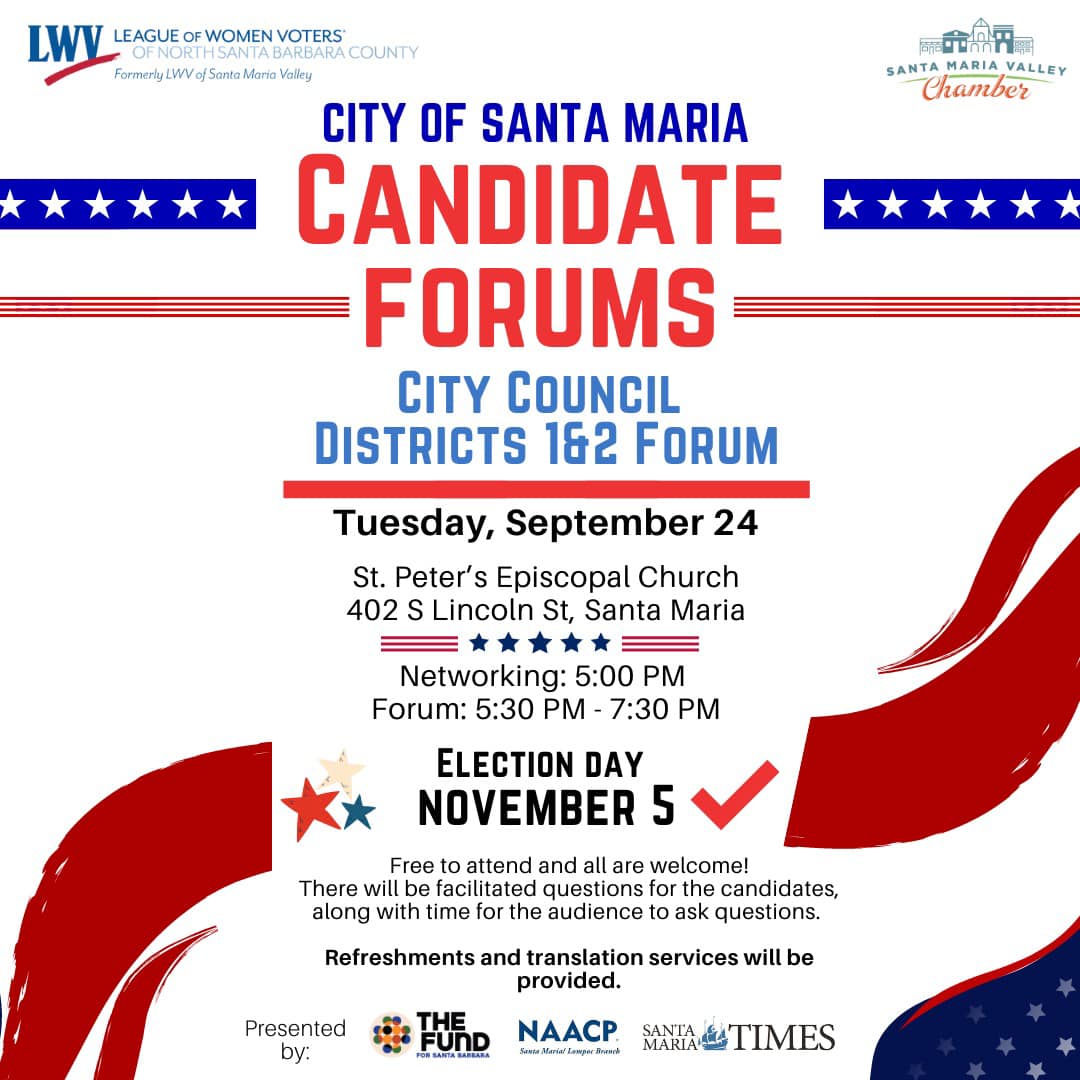Los foros de candidatos de la ciudad de Santa María de 2024 están organizados por la Liga de Mujeres Votantes del Norte del Condado de Santa Bárbara y la Cámara de Comercio del Valle de Santa María. Agradecemos al Fondo para Santa Bárbara, la NAACP y el Santa Maria Times por su colaboración en este evento. Agradecemos a los patrocinadores del programa de inversores de la Cámara , que hacen posible el apoyo de la Cámara a programas como los foros de candidatos de 2024.