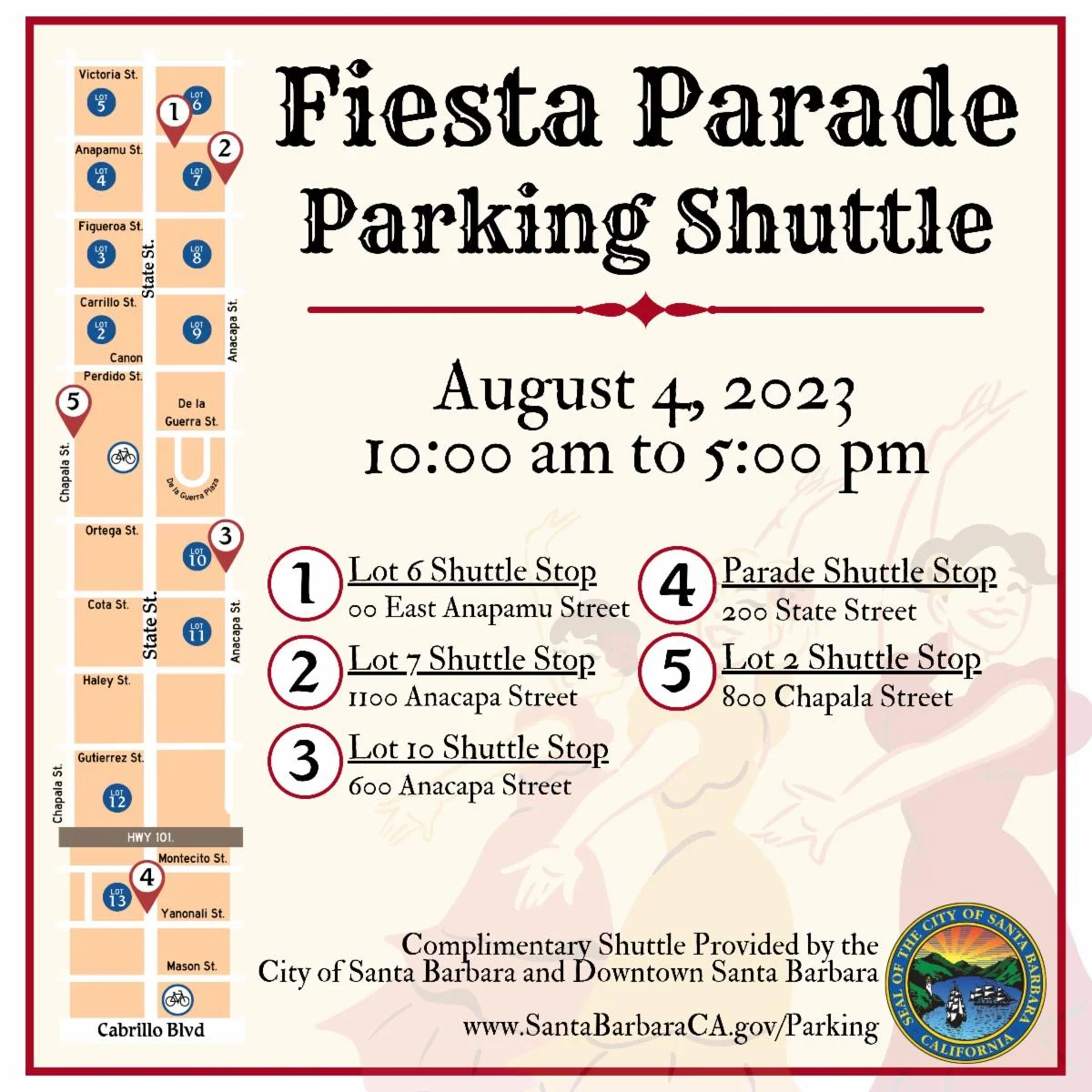 Los autobuses recogerán a los huéspedes cerca del Garaje Canon Perdido, el Garaje Granada, el Garaje Biblioteca y el Garaje Ortega. Los invitados serán transportados cerca de la estación Amtrak de Santa Bárbara en State Street y Yanonali Street.