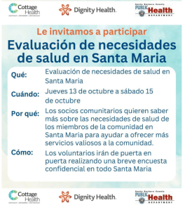 (SANTA MARIA, California) – El Departamento de Salud Pública del Condado de Santa Bárbara, en asociación con Cottage Health, ha completado el análisis de subpoblación de la Ciudad de Santa María como parte de la Evaluación de Necesidades de Salud Comunitaria (CHNA) de 2022. Realizada en octubre del 2022, la Evaluación de Necesidades de Santa María (SMNA) fue una de las dos evaluaciones de necesidades de subpoblación realizadas en la CHNA.