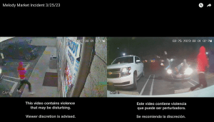 Los detectives también están compartiendo videos de cámaras de vigilancia colocadas en el exterior de Melody Market. Los videos contienen violencia que puede ser perturbadora para los espectadores. Los videos muestran el incidente desde dos ángulos diferentes y comienza justo antes de las 8:00 p.m., cuando dos vehículos, con cuatro ocupantes en cada vehículo llegaron por separado a Melody Market. Uno de los ocupantes de los vehículos era Manuel Reyes Ríos, de 19 años, de Santa María. Momentos después, el Oficial Peña llegó en su vehículo personal con su familia. Un tiempo después también llegó un cuarto vehículo, con una mujer y sus dos hijos.