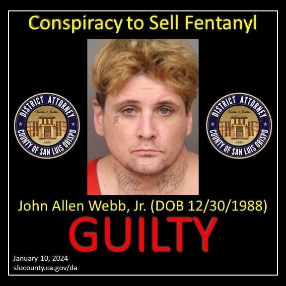 El fiscal de distrito Dan Dow anunció hoy que un jurado del condado de San Luis Obispo ha encontrado a John Allen Webb, Jr. (DOB 12/30/1988) de Atascadero culpable de conspiración para poseer fentanilo en venta, posesión de fentanilo mientras estaba armado con una pistola cargada, siendo un delincuente condenado en posesión de un arma de fuego y munición, falsa personación de otra persona y posesión de fentanilo mientras estaba en la cárcel.