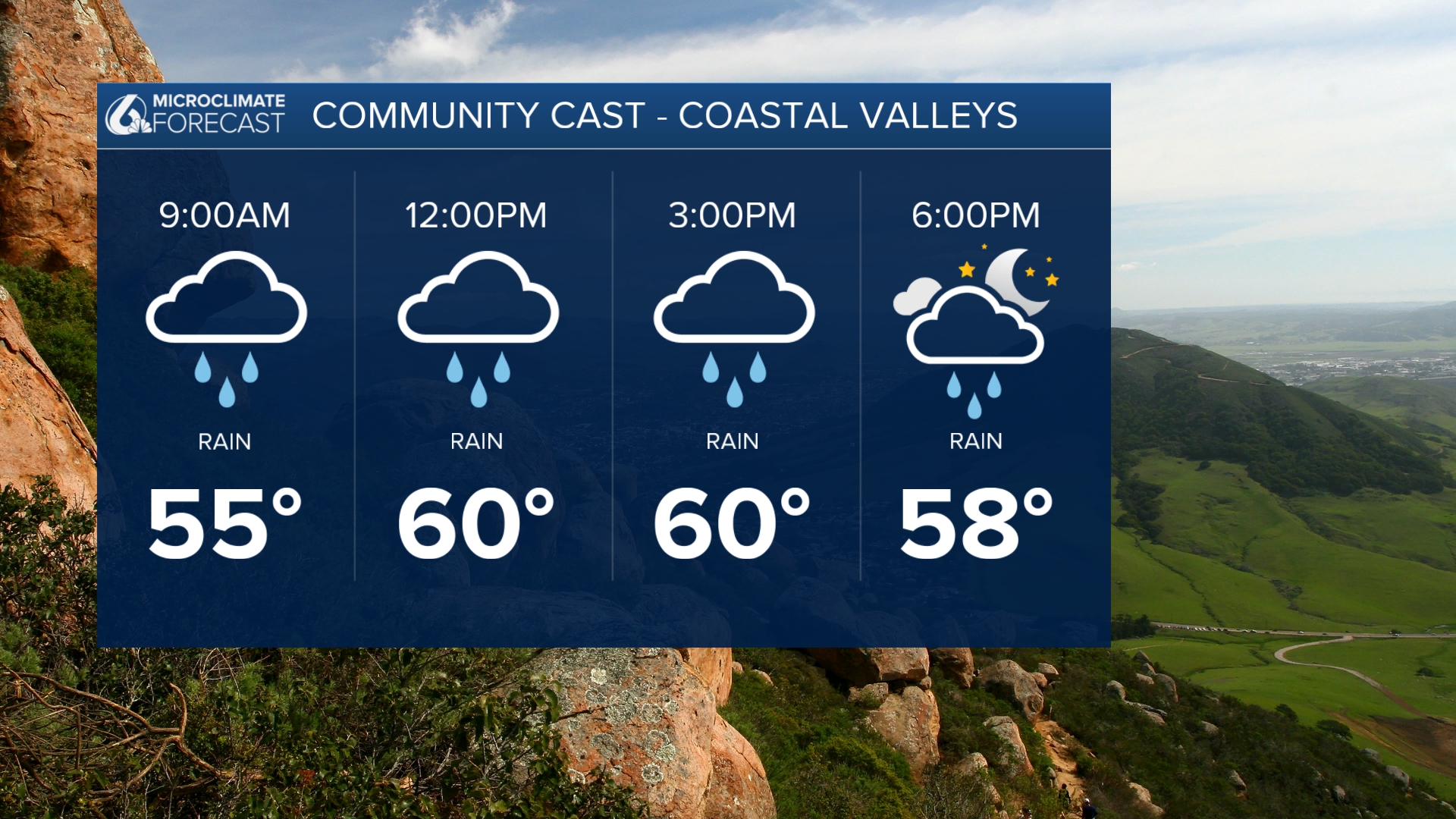 La lluvia continuará hasta el domingo, cuando veremos un pequeño descanso en la lluvia. Hasta entonces, ten ese impermeable a mano. Esperamos recibir otra pulgada de lluvia en el norte del condado de San Luis Obispo, más cerca de tres cuartos de pulgada en SLO y Santa María y la costa sur más cerca de media pulgada.