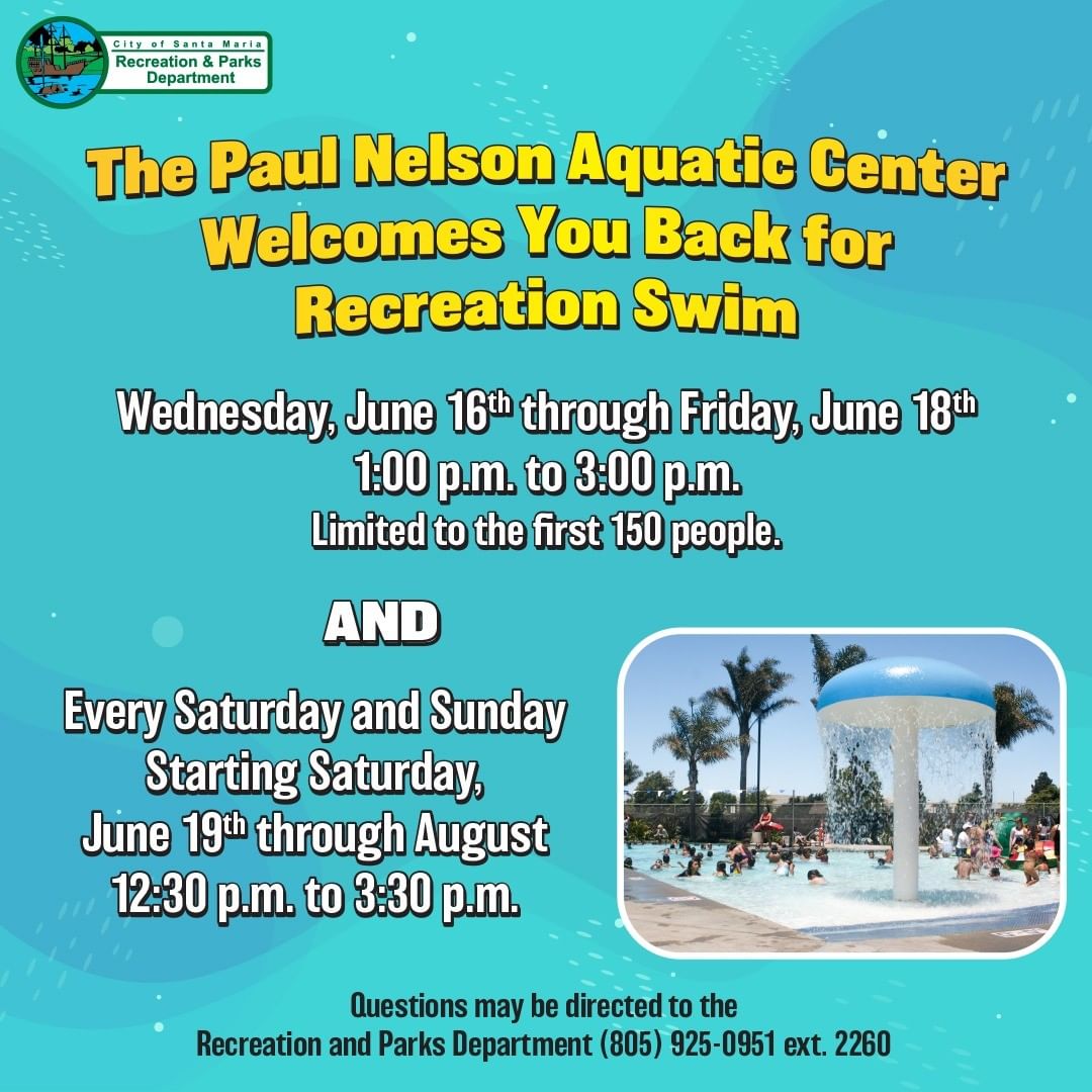El Departamento de Parques y Recreación de la Ciudad de Santa María da la bienvenida al público a nadar recreativo. El Centro Acuático Paul Nelson, 600 South McClelland Street, estará abierto para natación recreativa a partir del miércoles 16 de junio hasta el viernes 18 de junio de 1:00 a 3:00 p.m. (capacidad limitada). Además, la natación recreativa semanal de fin de semana se reanudará el sábado 19 de junio de 12:30 a 3:30 p.m.