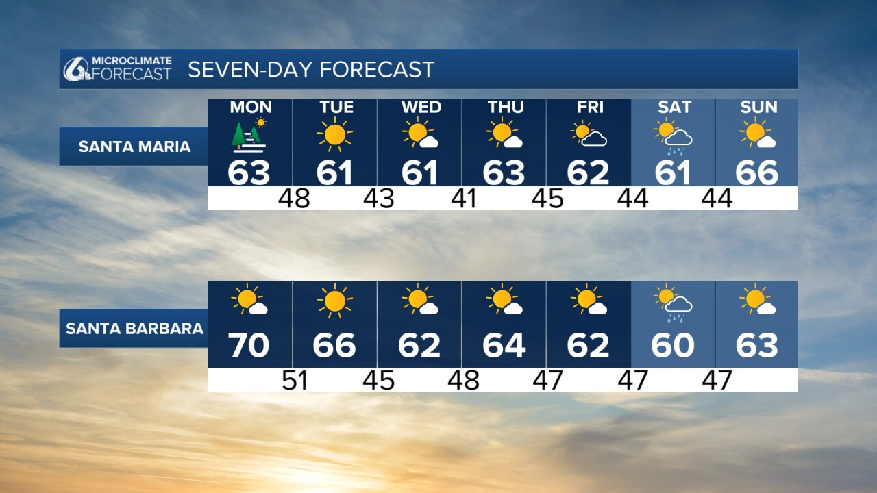 Gracias al frente frío, las temperaturas están bajando. En los valles interiores, las temperaturas rondarán los 60 °F, en los valles costeros los 60 °F y en las playas los 50 °F. Las únicas temperaturas más cálidas se registrarán en la costa sur, alrededor de los 75 °F.