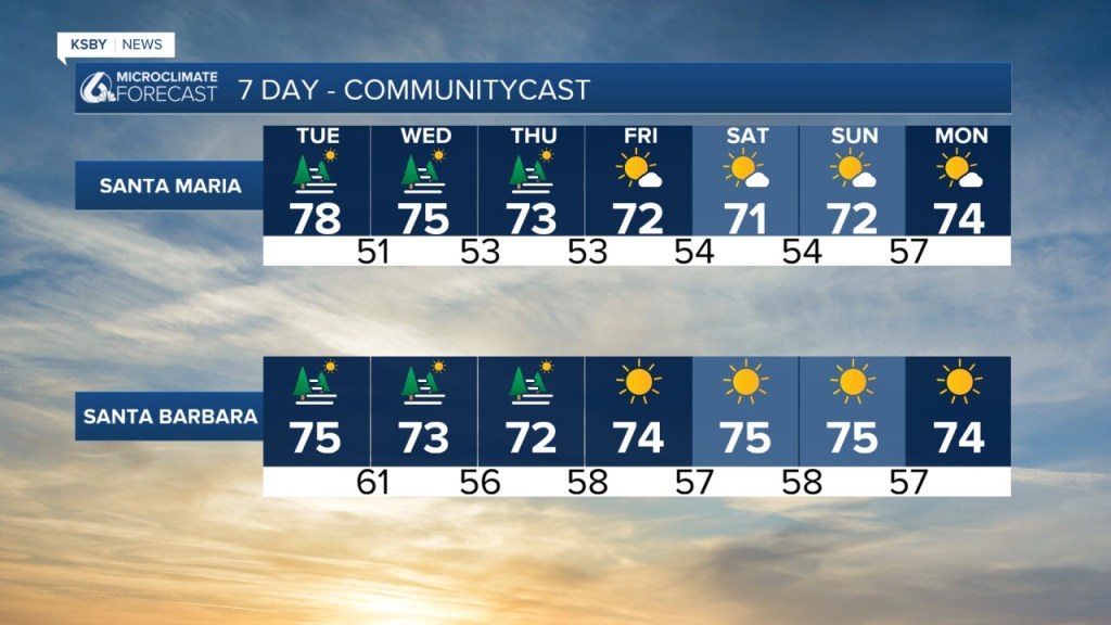 Esta mañana ha empezado un poco más nublado que los últimos días, la buena noticia es que el sol volverá a tomar el control más tarde esta mañana.Las temperaturas en toda la región serán uno o dos grados superiores a lo normal para esta época del año. Esto hará que en los valles interiores las temperaturas se sitúen cerca de los tres dígitos, entre 21 y 27 °C en los valles costeros. Las playas serán las más frescas, con temperaturas máximas de hasta 15 °C.