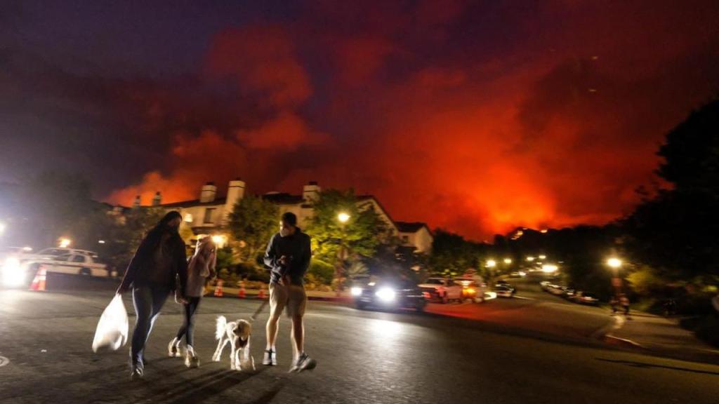 Aproximadamente un millar de residentes del área del Cañón de Topanga recibieron la orden de evacuar sus hogares mientras las llamas corrían a lo largo de las crestas, enviando una enorme columna de humo y lluvia de cenizas a través de los vecindarios circundantes y la autopista US 101 hacia el norte.