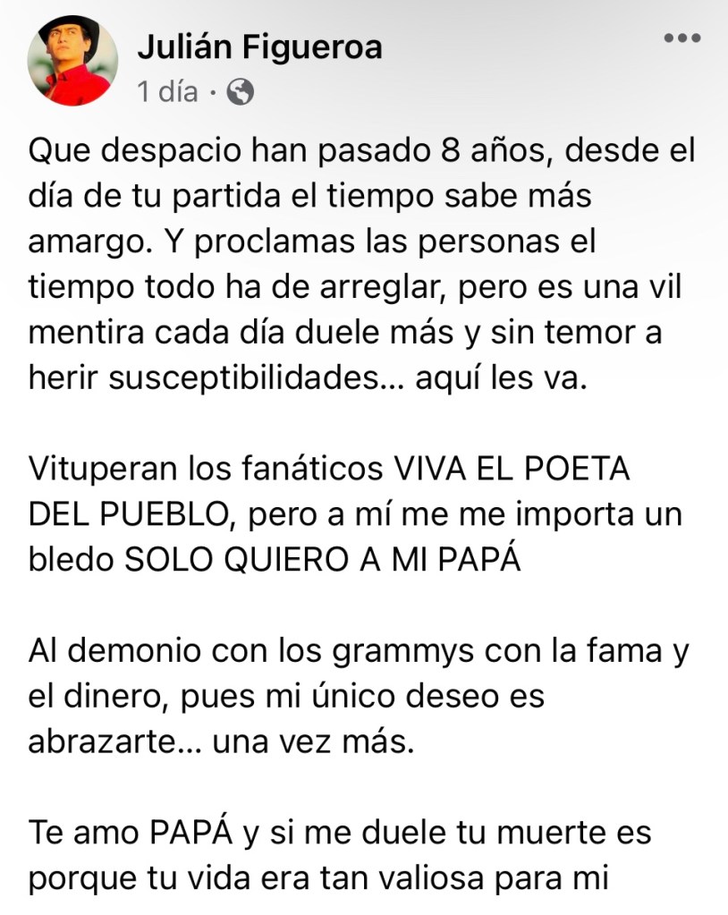 Ayer Julian Figueroa le dedicó este mensaje a su fallecido papá Joan Sebastián en sus redes sociales.