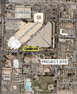Burt y Mark Fugate, desarrolladores de padre e hijo del Valle de Santa María, solicitaron construir un edificio de seis pisos y 54,590 pies cuadrados con 104 unidades de departamentos y 2,100 pies cuadrados de espacio comercial en la planta baja en un sitio de 0.44 acres en la cuadra 200 de Calle East Cook.