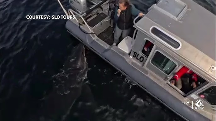 de 16 a 18 pies salió del agua inesperadamente, dijo el representante, golpeando el costado del bote y asustando a dos personas a bordo. La compañía compartió el video en su página de Instagram, @slo.tours , donde un comentarista dijo que era «el equivalente de un tiburón a un puñetazo». El encuentro ocurrió a unas 3 millas de la costa, dijo el representante. Afortunadamente , no necesitaron un bote más grande y no se reportaron heridos.