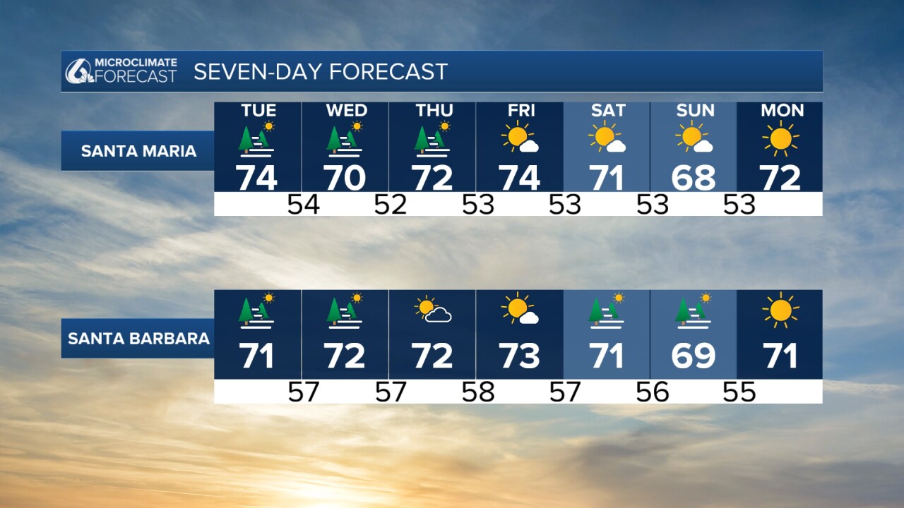 La niebla volverá a ser la protagonista el miércoles por la mañana, aunque en menor medida. Las temperaturas serán un poco más moderadas durante el resto de la semana, pero aún se pueden esperar temperaturas de 90 grados en el interior, 80 grados cerca de SLO y 70 grados en Santa María y Santa Bárbara.