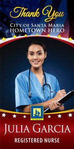 El programa Hometown Heroes Banner se creó en 2016 para honrar a los residentes de Santa María que sirven o han servido en el ejército. La actual pandemia de COVID-19 ha puesto de relieve a los héroes locales que luchan batallas más cerca de casa. Los socorristas, los profesionales de la salud y muchos otros trabajadores esenciales han estado trabajando activamente para mantener segura a la comunidad de Santa María.