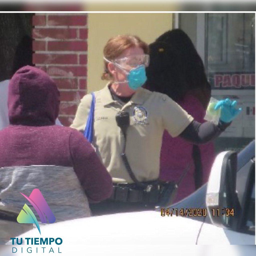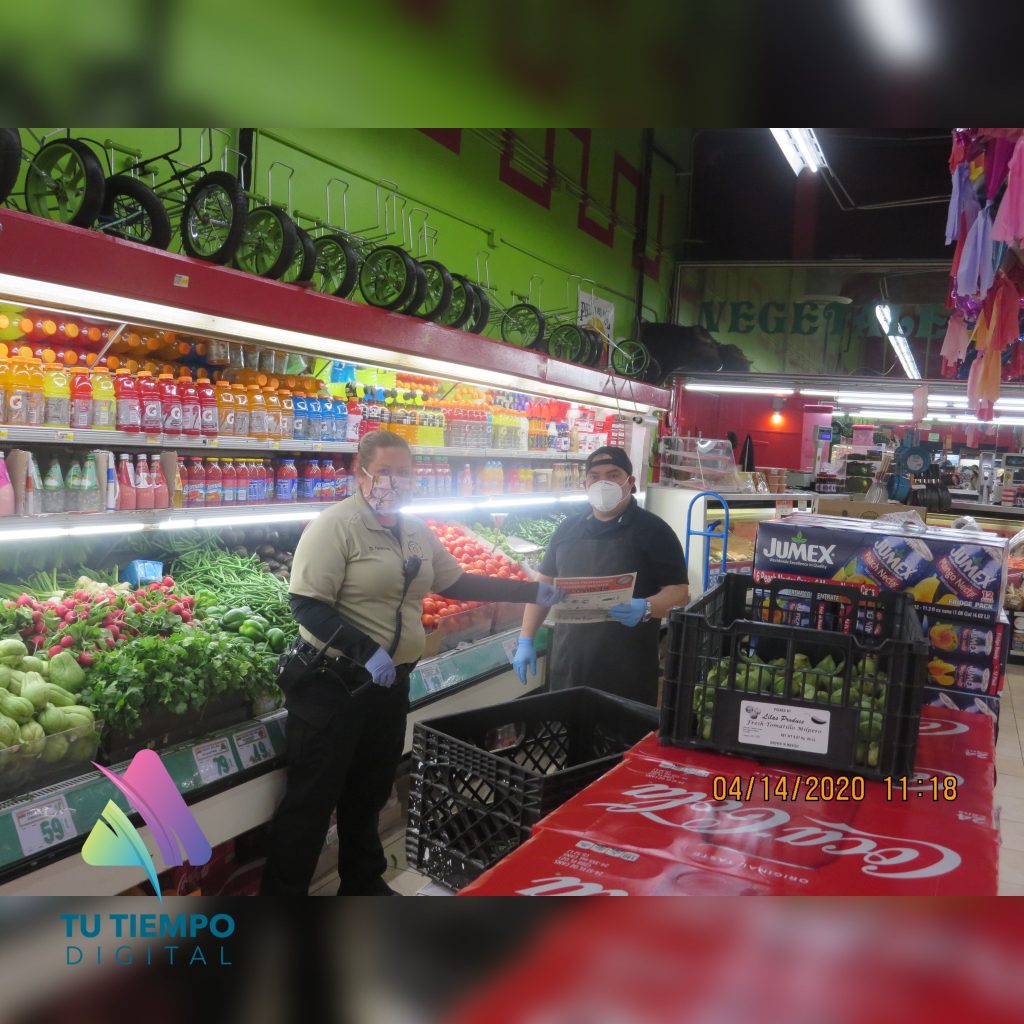 Con máscaras y guantes protectores, los oficiales visitaron negocios en toda la comunidad. Distribuyeron folletos educativos bilingües a los supermercados locales. Los folletos deben ser anunciados por las tiendas para informar a sus clientes de todas las precauciones de salud establecidas para luchar contra COVID-19.