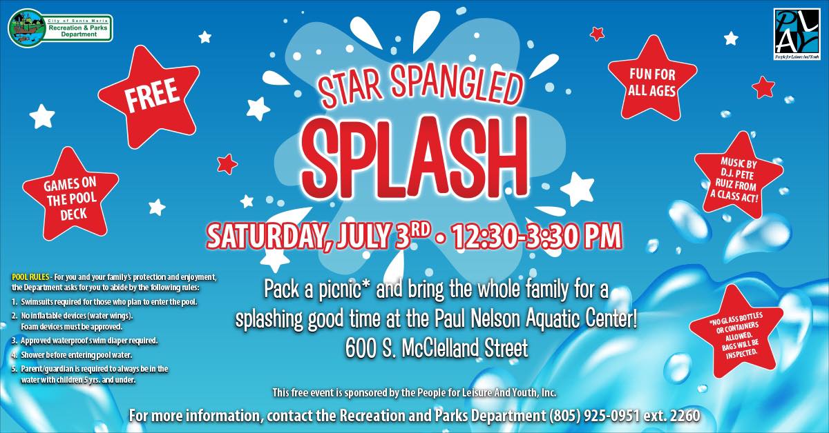 El Star-Spangled Splash es un evento de temática patriótica para toda la familia e incluye música de D.J. Pete Ruiz de A Class Act, así como juegos recreativos para niños de 6 a 12 años. Traiga a familiares y amigos para disfrutar de un evento al aire libre lleno de diversión. Se anima a los huéspedes a traer un almuerzo tipo picnic; sin embargo, los envases de vidrio no están permitidos debido a problemas de seguridad.