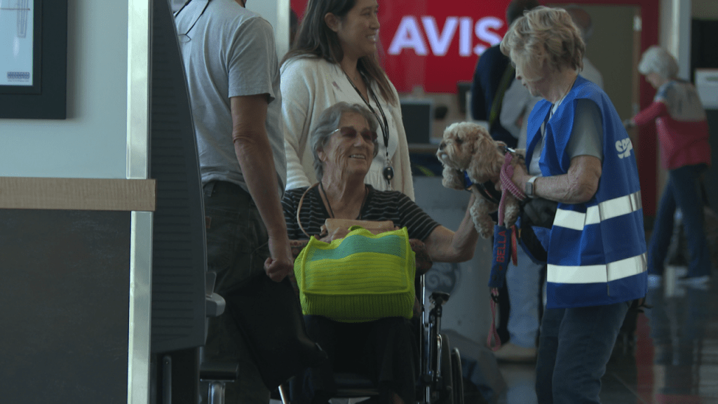 Durante más de tres años, Barbara Nicholson y su perra, Bella, han llevado amor a personas de todo el condado y el lunes fue su primer día en el aeropuerto.