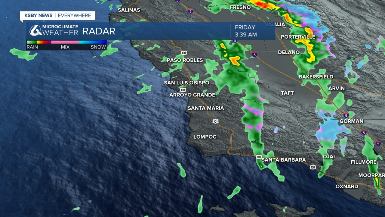 Existe la posibilidad de tormentas eléctricas el viernes por la mañana en los valles costeros y las regiones costeras de la costa central. San Luis Obispo y Santa Bárbara podrían ver algo de actividad de tormenta eléctrica antes de las 10 am, lo que podría significar que es posible una pulgada de lluvia adicional. A las 3:30 am, el radar mostraba lluvias dispersas en la costa central, con lluvias más intensas en la parte este de los condados de Santa Bárbara y San Luis Obispo.